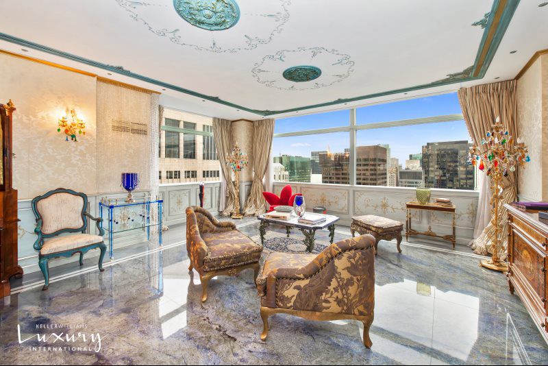 This is simply a must-see apartment. Words and even photographs cannot fully portray the magnificent workmanship and detail which have gone into creating this sublime two bedroom, two bath residence high up in Trump Tower. Dazzling City views of Manhattans iconic buildings create the backdrop for this extraordinary apartment with all corner rooms facing south and east, flooded with light during the day and breathtaking by night. One enters the apartment into a beautifully appointed foyer with discreetly concealed closets and rare blue lapis floors which draw you in and extend throughout the open living room. Extraordinary workmanship is displayed in every detail from the hand-painted wainscoting throughout much of the apartment to the intricate ceiling moldings with hand-painted details. The living room opens east into an inviting, comfortable den, extending the living/entertaining space and can also serve as a permanent or occasional bedroom with its own en-suite bath. The spacious master bedroom is positioned off of the foyer entered through a private hall with a very generous and fully customized walk-in closet. The master bathroom is a work of art in its own right with immense slabs of contrasting, complimentary marble surrounding a large, luxurious shower and a separate dressing table appointed with a rare, polished jewel-like countertop. The kitchen with top-of-the line appliances is embellished with hand-painted cabinets. This is a very rich and elegant apartment which will be appreciated by the most discerning person and is not to be missed. Offered Furnished or Unfurnished!